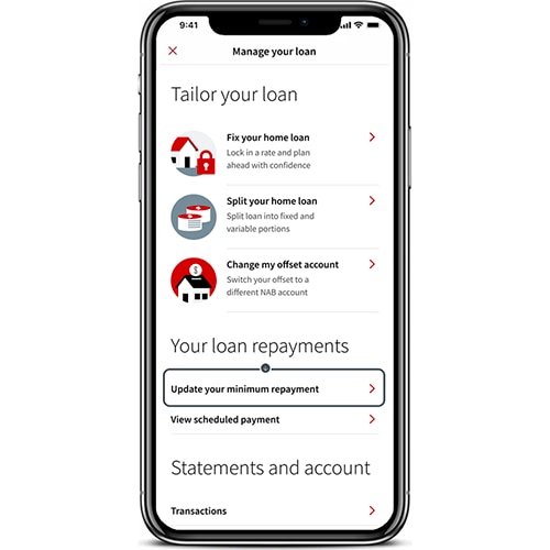 When interest rates decrease, your minimum contracted repayment on a principal and interest home loan will not automatically reduce. If you're eligible, you can update your minimum repayment using the NAB app: