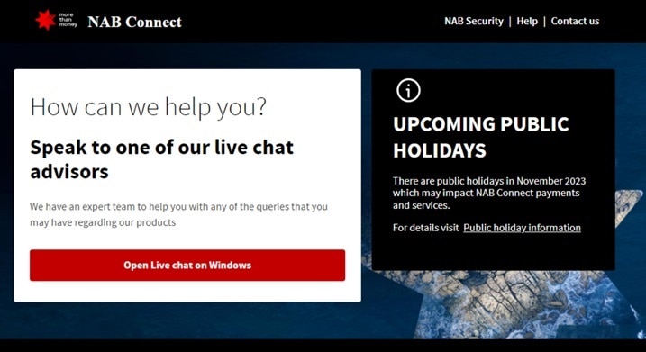 - A fake NAB and NAB Connect page will ask customers to open a "live chat".