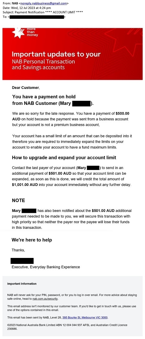 We’re aware of NAB-branded emails sent by criminals which states that your payment is on hold, and you need to upgrade to a business account. You may be asked to transfer funds back to the buyer to secure the transaction. Do not send funds. This is a scam.