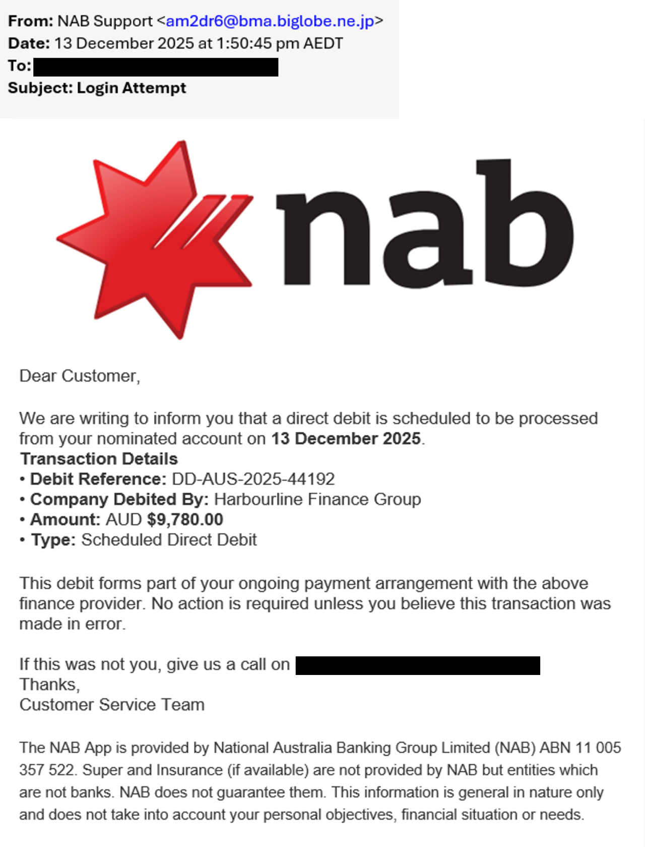 NAB is aware of phishing emails attempting to impersonate ‘NAB Support’ with a Customer Service Team sign-off. The email may say there’s been a recent direct debit scheduled that has been applied to your account.